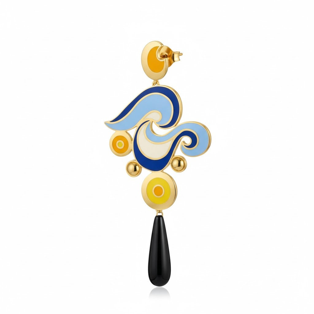 Questo mono orecchino unisce forme e colori in un dialogo tra luna, cielo e notte stellata. Ogni dettaglio racconta un movimento, una luce, un sogno.